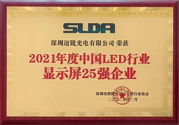 近日,福日電子成員企業邁銳光電榮獲“2021年度中國LED行業顯示屏25強企業”及“《Mini LED室內商用顯示屏》優秀參編團體”兩項行業榮譽。
